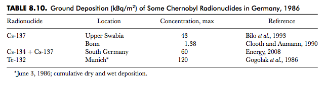 7. ドイツ:放射性セシウムの合計の平均土壌沈着量は1平方メートルあたり6,000ベクレル(Energy, 2008)だったが、南ドイツにおける個々の放射性核種の濃度はそれよりもずっと高かった(表8.10)。