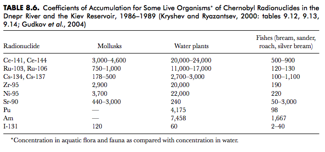 5. 1986年7月、チェルノブイリ原発付近の水域における粘土中において、放射線量に寄与する主要な核種はニオブ98(1キログラムあたり2万 7,000ベクレル)、セシウム144(1キログラムあたり2万100ベクレル)、ジルコニウム96(1キログラムあたり1万9,300ベクレル)だっ た。1987年3月から4月の水生植物におけるニオブ95の濃度は1キログラムあたり2万9,000ベクレルに達し、ニワトリにおけるジルコウム95濃度 は最大で1キログラムあたり14万6,000ベクレルだった(Kryshev et al., 1992)。