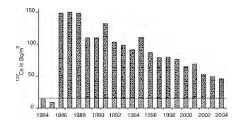 7. スウェーデン:バルト海南部にあるゴットランド島近海の表層水における、1984年から2004年の年間平均セシウム濃度を図8.2.に示した(1キログラムあたりのベクレル数)。