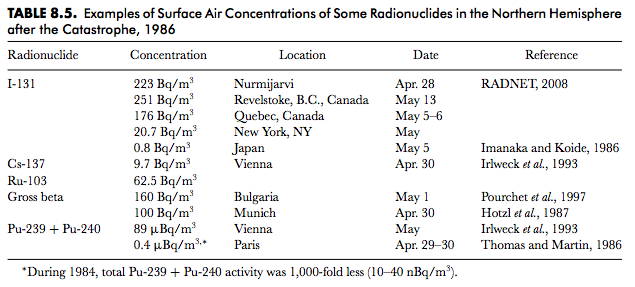 表8.5. 1986年、北半球の地表の空気中における放射性核種の濃度、大惨事後(1986年)に計測